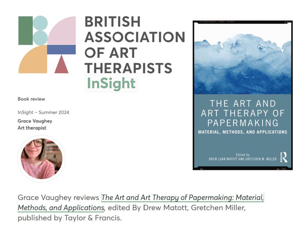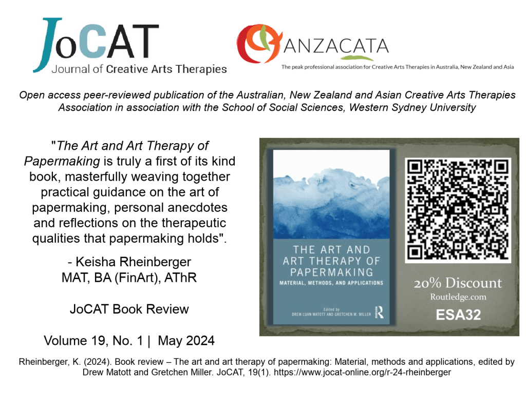 “The book presents a compelling, approachable and accessible introduction to the process of papermaking which emphasises its potential to enrich the therapeutic process through repetition, endurance, and resilience. As a reader, I was left feeling inspired and nourished. This book would be a fantastic companion to any art therapist, trainee art therapist, socially engaged artist or community artist who has an interest in narrative reclamation, personal voice, cultural objects, and meaning-making.”